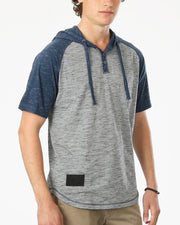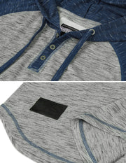 - - Contrast raglan henley style hoodie with button closure and rounded bottom hem, Contrast Seam Lines
